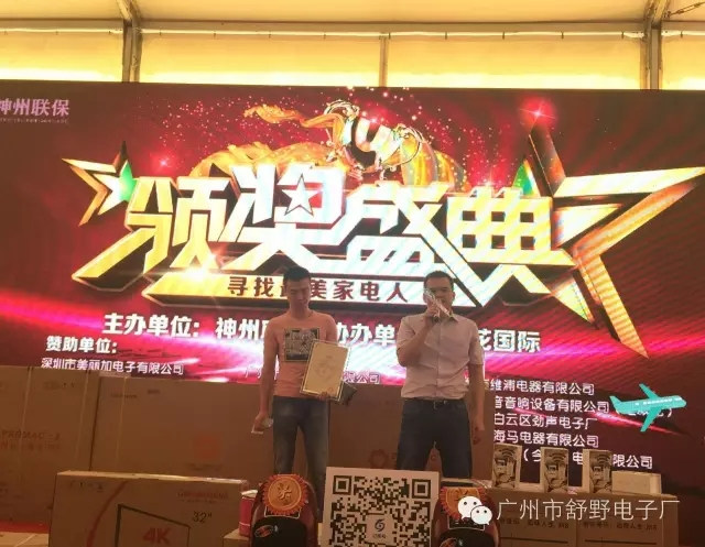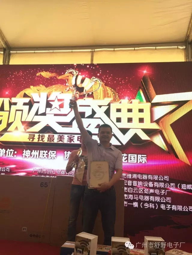 颁奖现场人头涌涌,吸引了众多的采购商围观,纷纷向获奖企业表示祝贺。绚丽的舞台、动感的音乐、大屏幕上参赛选手的剪影,瞬间吸引了大批观众前来活动现场观看。“寻找最美家电人”音响行业的冠军由来自广州市白云石井舒野电子厂的谭景生获得。中国音响业著名职业经理人谭景生总经理于一九九七年进入音响行业至今已20年,在业内以经营稳健,诚信务实,开拓进取而著称。广州市舒野电子厂专业研发、生产、销售:专业卡拉OK功放机、专业后级功放级、专业卡拉OK音箱、专业舞台音箱、专业调音台、专业数码前置效果器和专业周边设备等等!谭景生总经理上台发表获奖感言,全程脱稿演讲,现场报以热烈的欢呼声和雷鸣般的掌声,将活动气氛飙升到一个新的高潮。